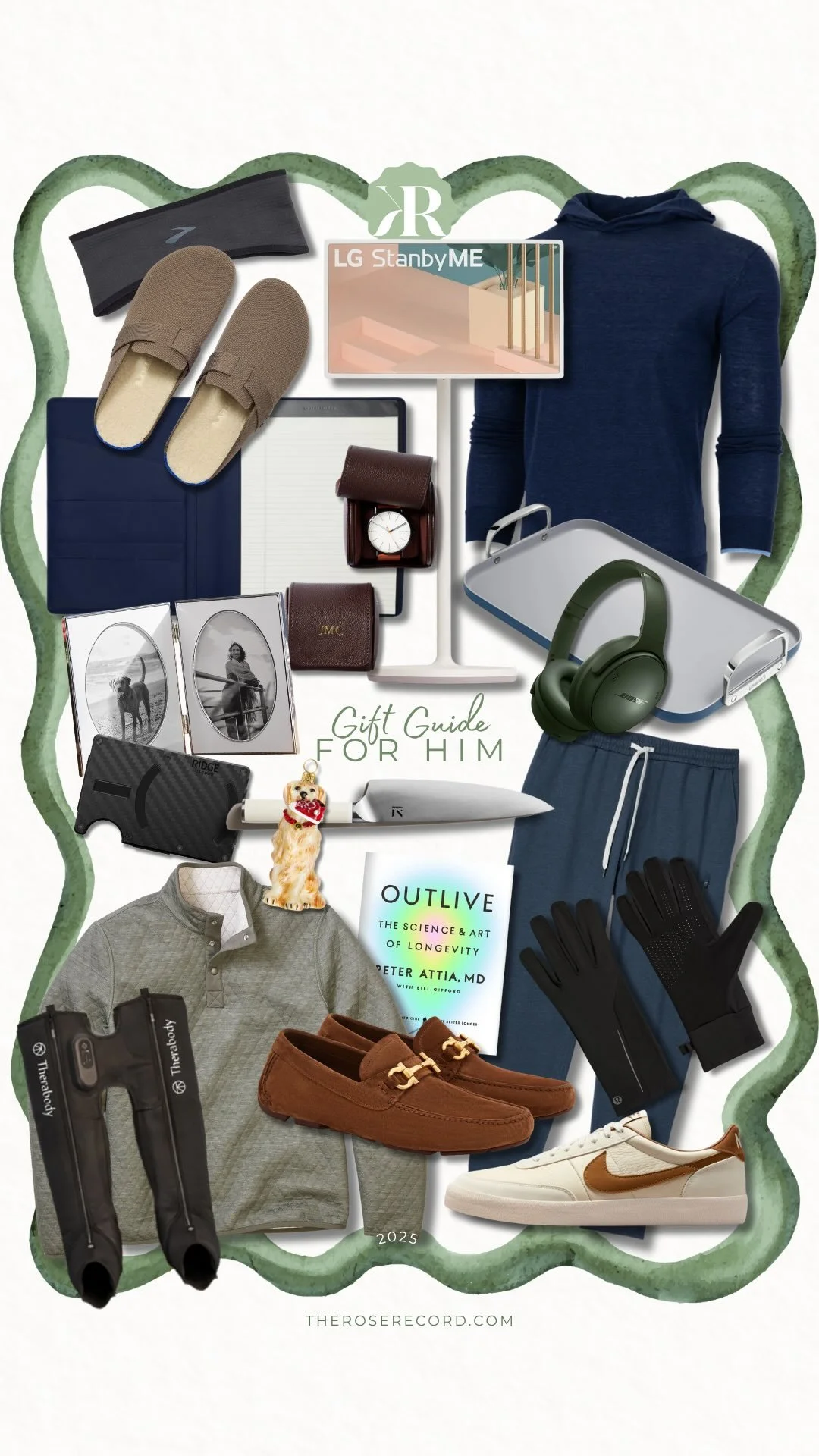 My sister and I always roll our eys at men’s gift guides because they’re so cliche. Whiskey! Golf! Sweaters! I’ve tried to find a few items here that are beyond the typial male gift guide content. From picture frames for their desk, a cool-dad sneaker, to very high end compression boots (we are at the 40 year old mid-life crisis workout all the time phase over here and we sore!), there is something for every guy on your list. Make sure to check out the larger list below the graphic for even more ideas!